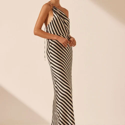 Women’s Slanted Shoulder Suspender Dress Black and White Twill Off-the-shoulder Sexy Party Ladies’ Sexy Long Dress