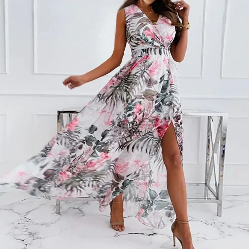 Women’s Sexy Sleeveless Floral Print Chiffon Backless High Slit Floor-Length Sundress Natural Waistline Casual Style for Holiday