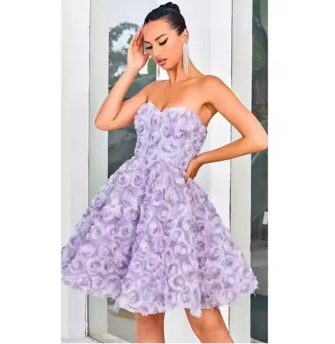 Women’s Purple Fairy-Style Short Evening Gown Sensual Sweet Off-the-Shoulder Dress 3D Roses Beading Decoration izable Size