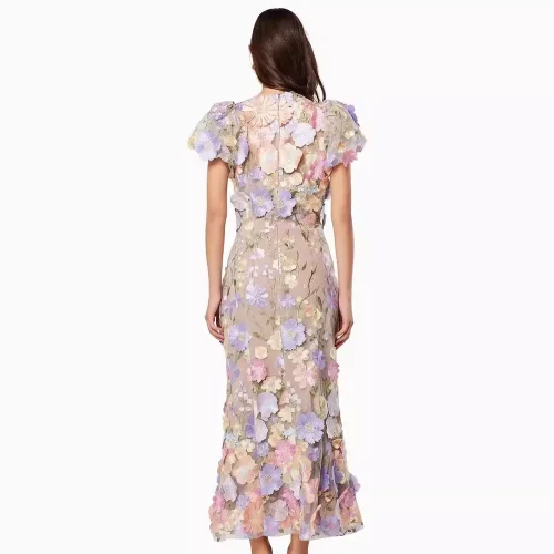 2025 Spring Luxury Embroidered Floral Mermaid Bodycon Dress Long Bubble Sleeve Floor-Length Chiffon Natural Waistline Woven