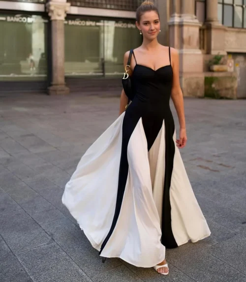2025 Olaesa New Design Elegant Sleeveless Knitted Chiffon Tulle Patchwork Maxi Dress Black White Hem Sling Dress