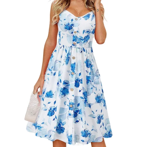 6226-SOPHIA-Casual Beach Sundress Floral V Neck Button Front Floral Dress With Pockets