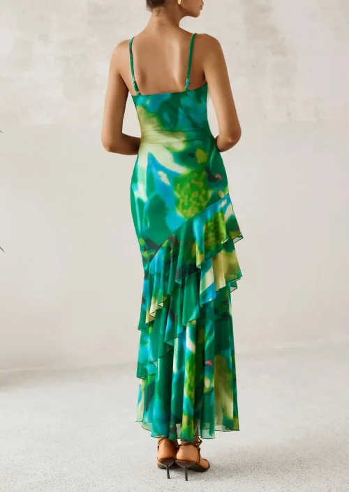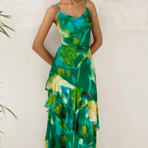 2025夏季女式马克西连衣裙分层碎花沙滩太阳裙意大利面条带甜美婚礼客人长裙ODM
