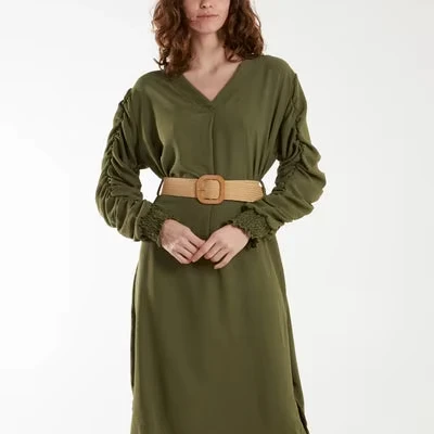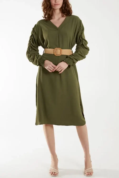 Beautiful New Arrival Summer V Neck Long Sleeves Cascading Ruffles Solid Wrap Midi Dress for Women At Best Price