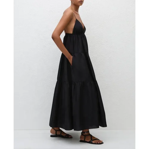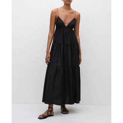 BAOLA Price Women Dress Triangle Tiered Sundress Side Pockets Organic Cotton Poplin Black Maxi Summer Dress