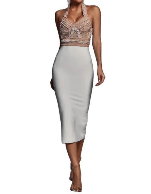 Bandage Manufacturer Women’s Pearl Beaded Midi Dress 2025 Elegant Halter Neck Birthday Party Dress Natural Knee-Length