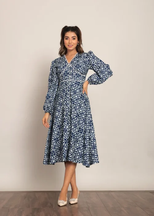 Blue And White Geometric Pattern Printed Midi Dress Beautiful Dress For Women Fancy One Piece Available At Affordable Price