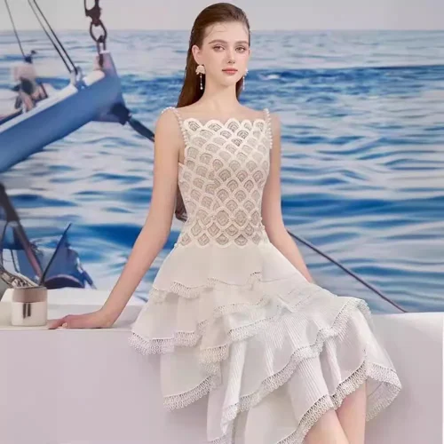 Bettergirl Vietnam Design Small Wave Splicing White Cake Dress Heavy Lace Waist Midlength Dress