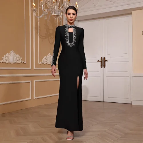 Black Long Sleeve Slim Fit Heavy Duty Beaded Women’s Evening Cocktail Dresses Gala Party Elegant