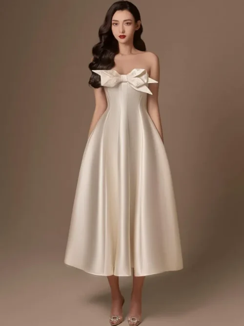 Bettergirl New Women’s Sexy Dress for Women Vietnamese Designer Stereoscopic Bow Satin Dress