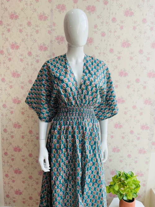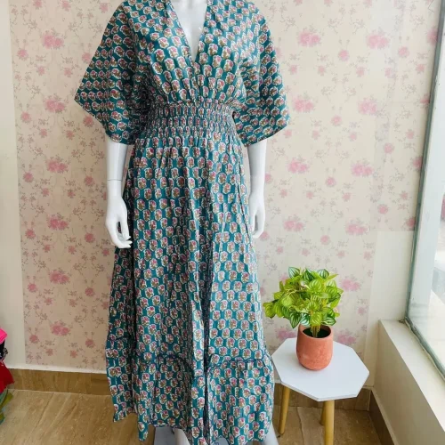 Block Print Women Clothing Kaftan Floral Print V Neck Dress Brides Made Dress