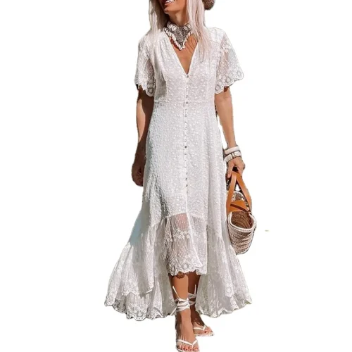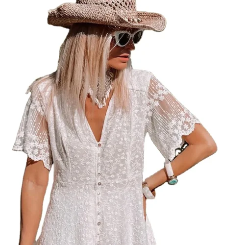 Bohemian White Lace Maxi Dress Women Summer Short Sleeve Floral Embroidery Long Dress Female Elegant Retro Casual Beach Sundress