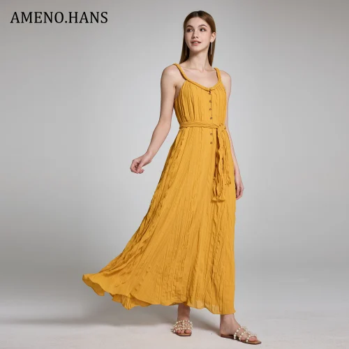 High Quality Ladies Pleated Casual Summer Solid Color Sashes Sundress Beach Maxi Dresses