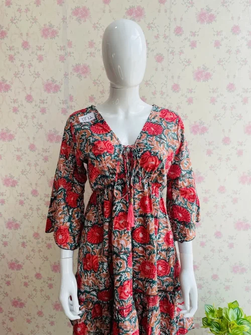 High Quality Cotton V-Neck Party Dress for Women Short Block Print Breathable and Patchwork Design for Autumn Season