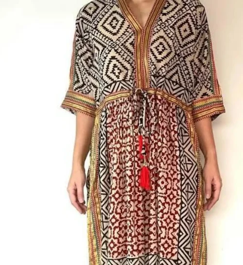 Jaipur Hand Block Print Long Kaftan Dress Zari Border Cotton Maxi Gown Dress V-Neck Sundress for Her Halloween Gift Beach Dress