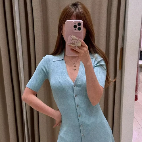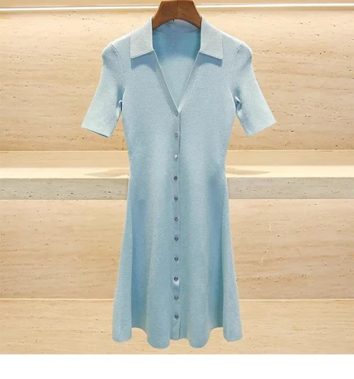 KD2243 High Quality Temperament Blue V-Neck Knit Short Dress Women’S Casual Dresses Polo Collar Ribbed Knit Women’S Dress
