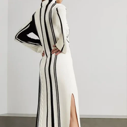Knitwear Manufacturers Contrast Color Stripe Turtleneck Long Sleeve Split Long Women Maxi Casual Sweater Knit Dress