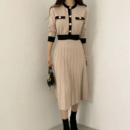 Knitwear Manufacturers Elegant Women’s Knit Slim a Line High Waist Pleated Dress Women Soft Ladies Long Sweater Dress