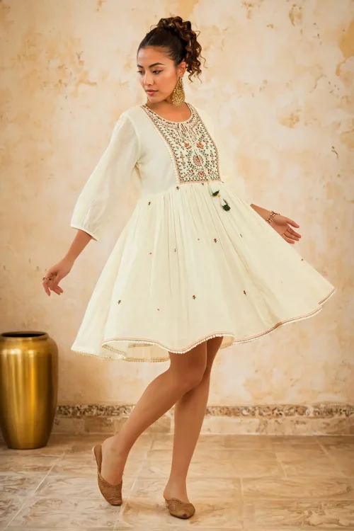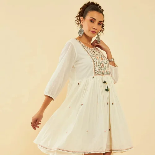 Latest collection White & Green Cotton Embroidered A-Line Ethnic Dress With TieUp long sleeve elegant looking dress for women