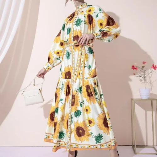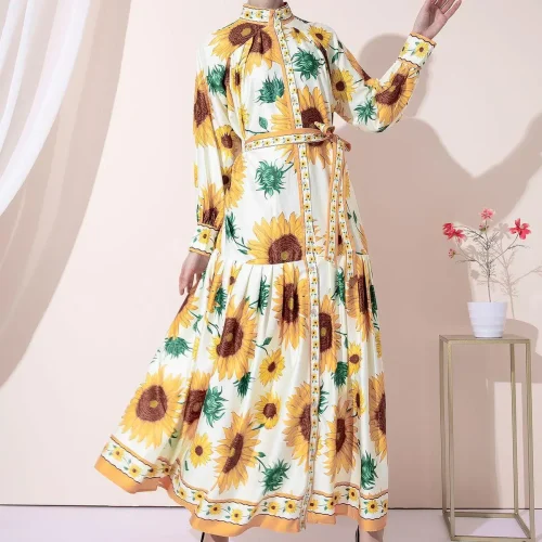 Ladies Causal Cotton Loose Autumn EOM Stand Collar Maxi Long Sleeve Floral Print Flower Sun Dress For Women