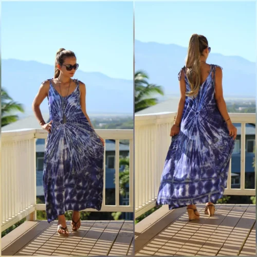 New Arrival Women’s Casual Tye Dye Long Sundress Sleeveless Printed Tie-Dye with Lace Decoration Dress for Casual Beachwear