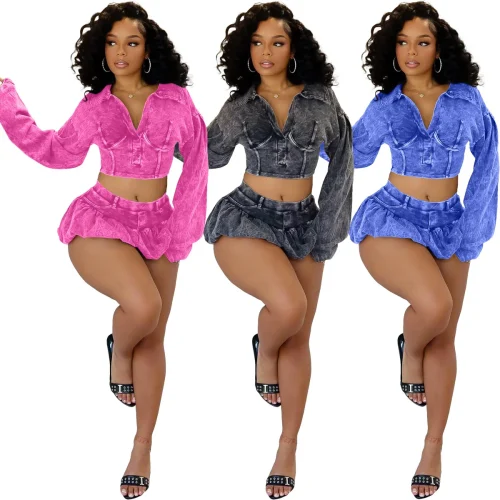 New Spring Women Skirts Suits Outfits Acid Wash Crop Top Dress Autumn Clothing Women Long Sleeve Coat Denim Skirt 2 Pieces Sets