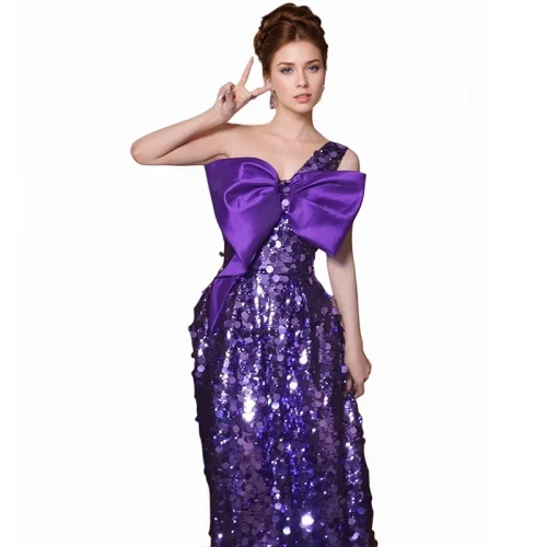 Purple Dress Beautiful Light Dress Daily Can Wear Long Bow Party Glitter Senior Sense Party Dress