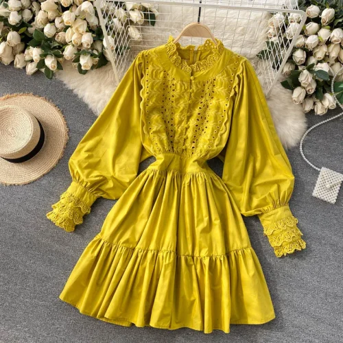 Q109013 Hepburn Short Lace Flower Lantern Sleeves Waist Slim Single-breasted Large-swing Ruffled Hollow Out Maxi Dress