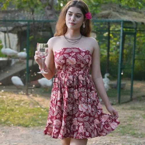 Red Floral Valentine’s Day Dress, Indian Hand Printed Cotton Summer Dress, Party Wear, Midi Dress, Off-Shoulder Dress