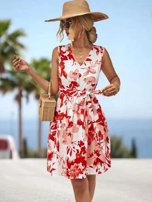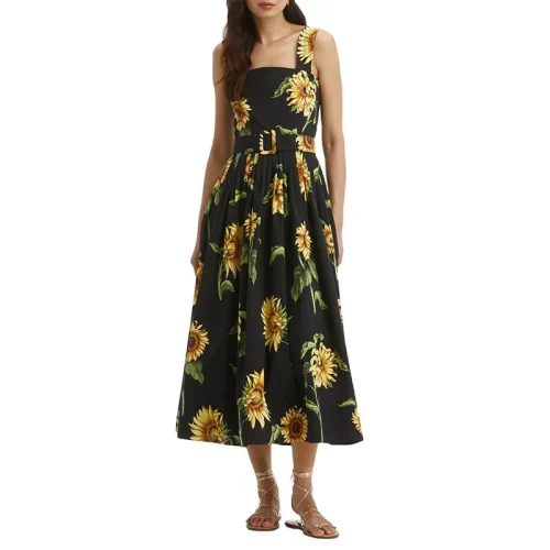 Quality Women Summer Sleeveless Sunflower Print Belted Maxi Long Dress Sundress