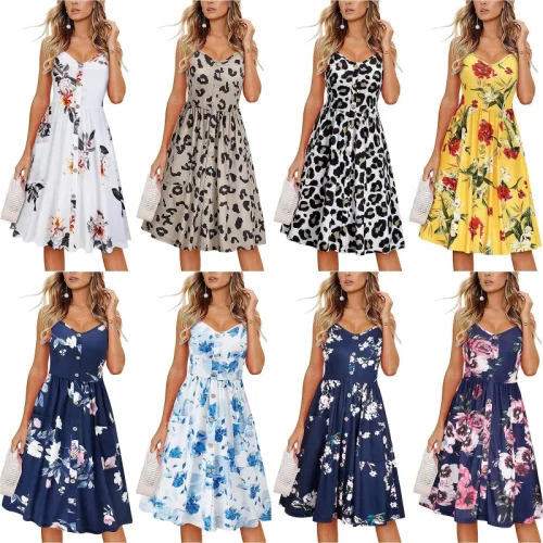 QFZ101 -Womens Summer Casual Beach Sundress Floral V Neck Button Front Floral Dress With Pockets