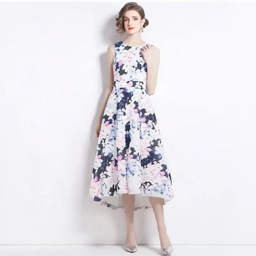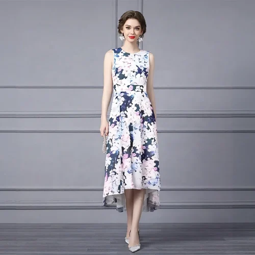Smart Casual Women Stylish Floral Sundress With High Waist Detail and Asymmetrical Hemline