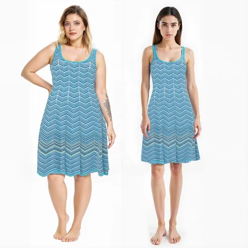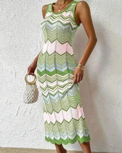 Summer Knitted Beach Dresses Splicing Stripe Sleeveless Summer Women Knitted Dress Holiday Sundress Hollow Out Long Dresses
