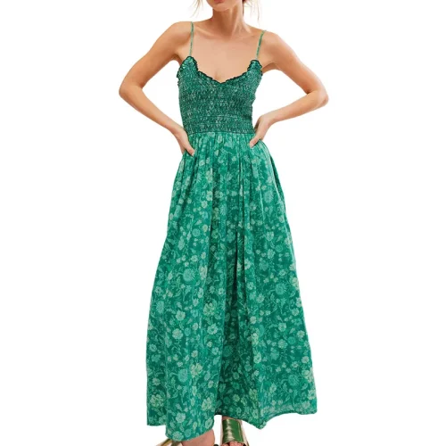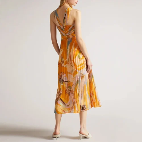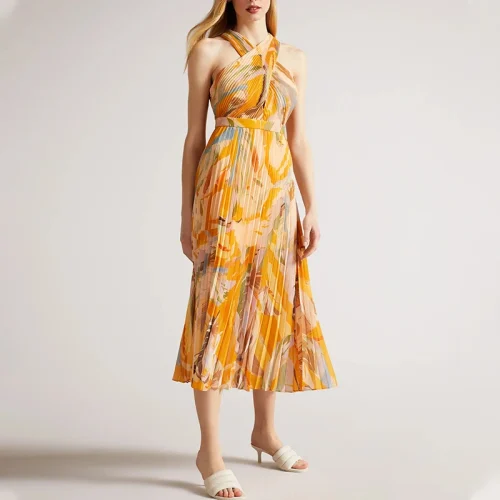 Summer Latest Ladies Women Casual Sleeveless Halter Plisse Sundress Pleated Dress Print Elegant Midi Long Chiffon Mini Floral
