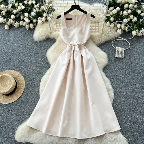 Summer Roman Square Collar Tunic Slim Casual Midi Dress For Women Sleeveless Empire Lace Dress