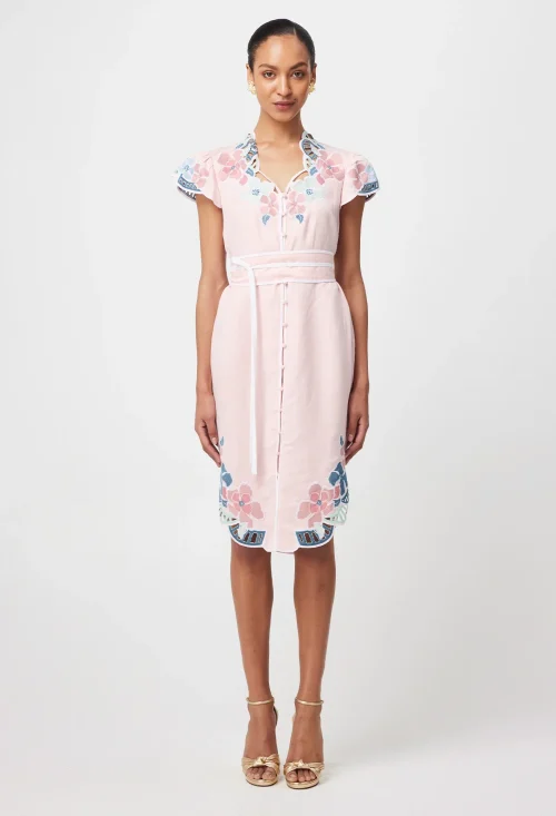 Summer Women’s Loose Cotton and Linen Printed Floral Embroidery Lace Trim Short Sleeve Beach Casual Maxi Dress
