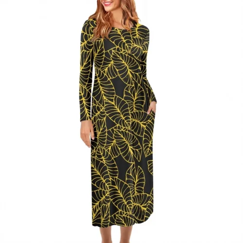 Sundress Kalo Leaf Design Dresses Women’s Dress Autumn Casual O Neck Long Sleeves Print on Demand Wearable Midi Gifts