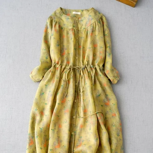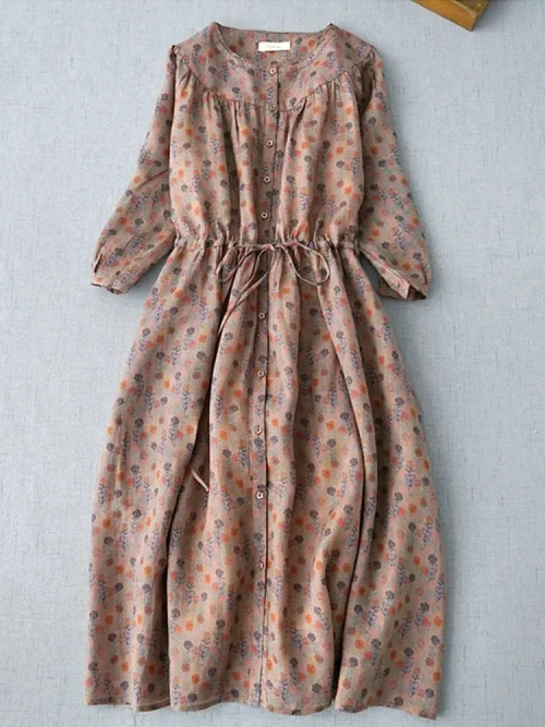 Vintage O-Neck Half Sleeve Women Shirt Dresses 2024 New Lace Up Patchwork Single-Breasted Midi Dress Floral Sundress