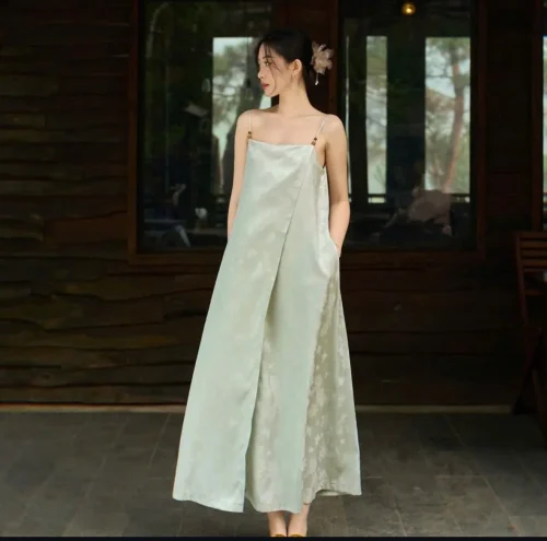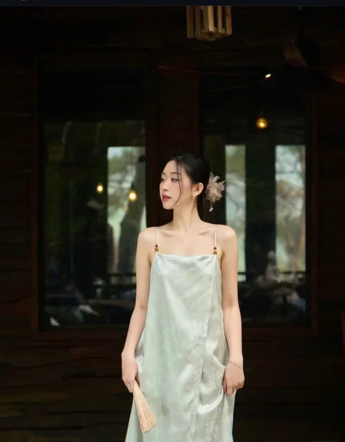 Vietnamese fashion brand Style for women’s 2-strap dress Light green Unique design Silk material