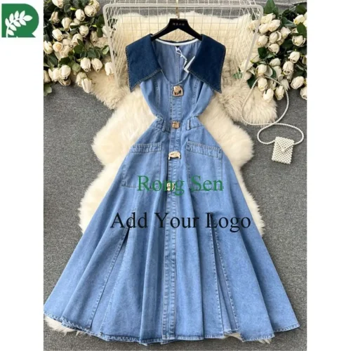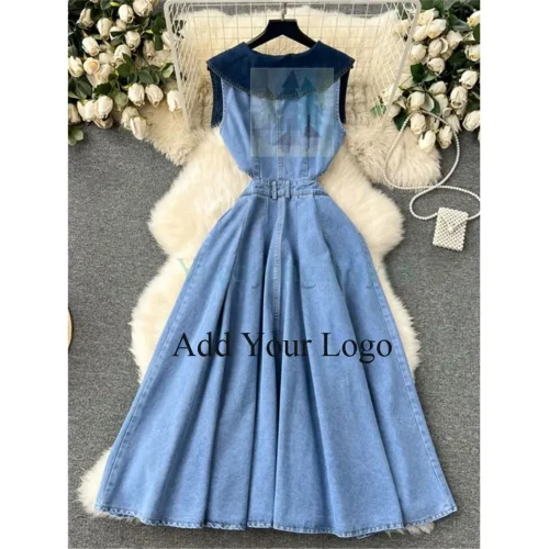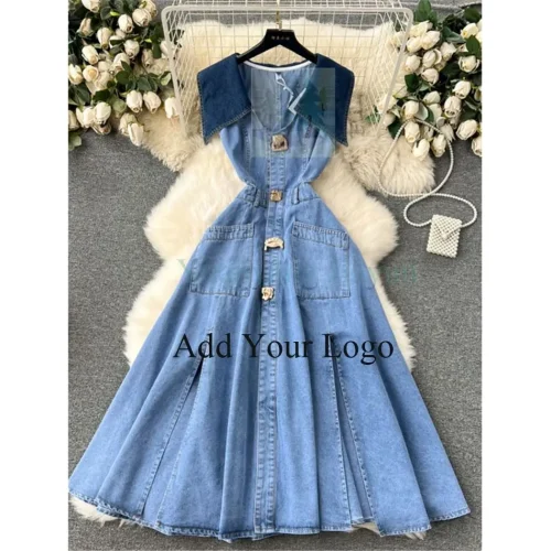 Vintage Casual Sexy Sleeveless Button Style Neck One Piece Split Jeans Skirts Midi Long Sundress Denim Women Dresses