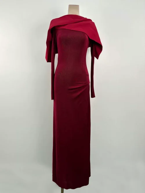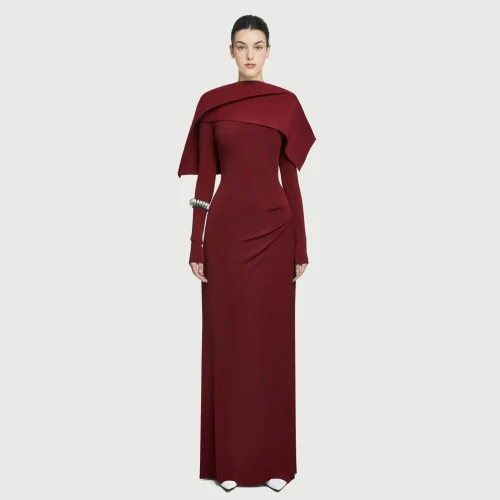 Vietnam 2025 Ramadan Collection Elegant Red Long Women Dress Casual Party Pleated Neck Slim Plain Evening Dress Fit Breathable