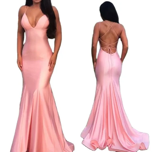 EV012 Sexy Deep V Neck Pink Mermaid Evening Dresses Long Backless Satin Evening Gown Formal Prom Dress Party Gown