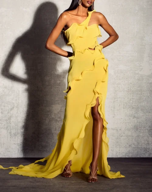 Elegant Style One Shoulder Formal Dress 2025 Flounce Hem Slit Evening Dress Yellow Halter Chiffon Maxi Beautiful Dress