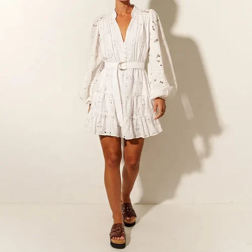 Elegant Women Clothes 100% Cotton Linen Long Sleeve Mini Dress With Belt Formal White Embroidery Hollow Casual Linen Dress
