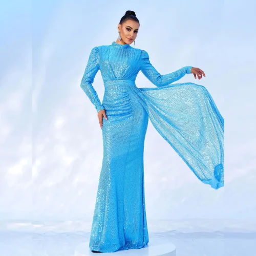 European and American Evening Dress Long Sleeved Temperament Sexy Slim Fit Long Sequin Banquet Bridesmaid Dress for Women
