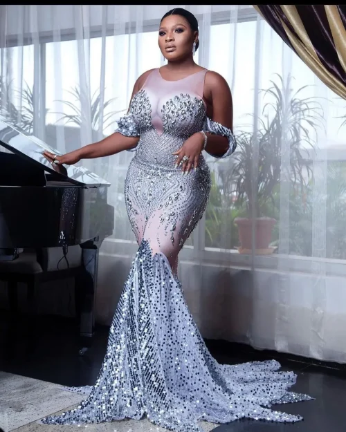 Evening Dress Women’s, Blue Dinner Party Show Host Waist-Tight Fishtail Sequins Bridesmaid Wedding Dress