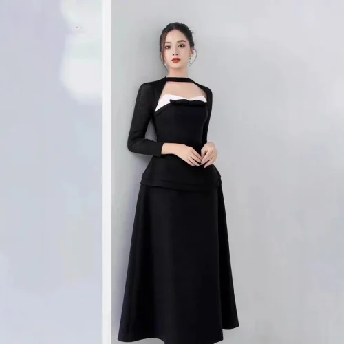 Fashion Temperament Bow Contrast Color Two-piece Dress Senior Sense Halter-neck Long Black Dress