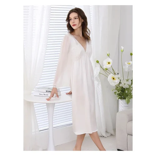 Spring and Summer New French Royal Style 19mm 100% Silk Long Dress V-neck Lace White Nightdress