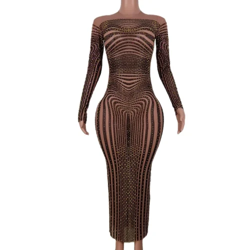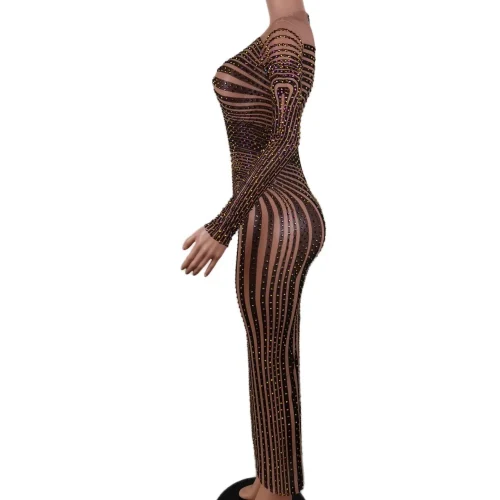 Sexy See Through Stripe Rhinestone Dinner Gown Cocktail Club Dress Elegant Birthday Prom Long Dress Women Formal Evening Dress