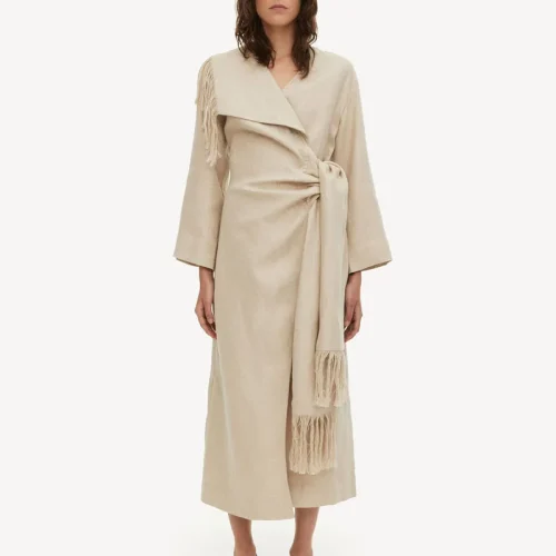 Modern Bohemia Tassel Ladies Dress With Drape Ruched Waist Linen Turn-Down Neck Long Sleeve Maxi Dress
